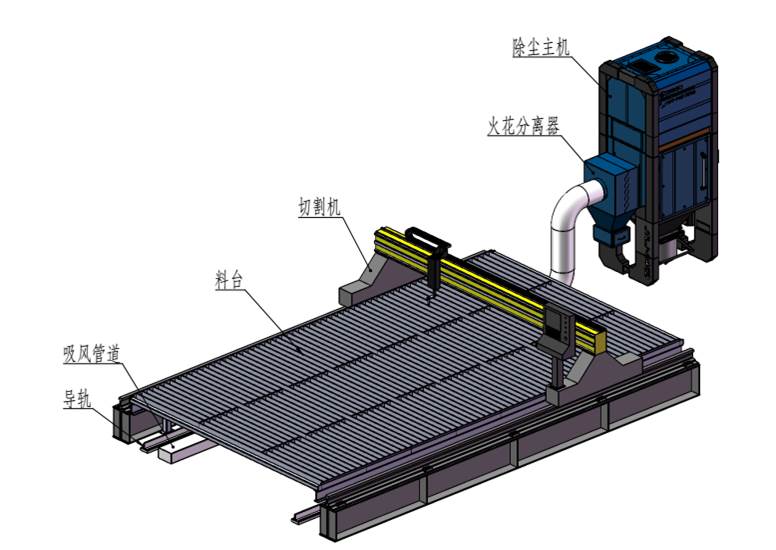 下吸式煙塵凈化系統抽風是通過下吸式抽風切割臺來實現的,下吸式抽風切割臺分成若干個區域,每個區域設計有風門吸風,切割槍頭在每個區域切割時,相應區域的風門打開抽風,將切割機的粉塵吸除。